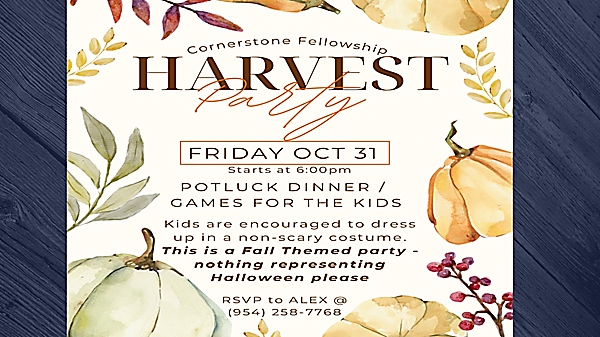 Event date: 10/31/2025 6:00 PM Export event Categories: Potluck Cornerstone Fellowship Harvest Party Potluck Dinner/Games for the Kids Next Article Sunday Morning Bible Study Print