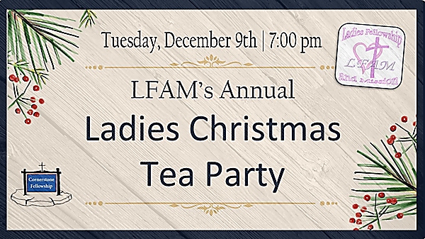 Event date: 12/9/2025 6:00 PM Export event Event Location: Cornerstone Fellowship Church Categories: Ladies Group LFAM’S Annual Christmas Tea Party Lois Sexton guest speaker Print